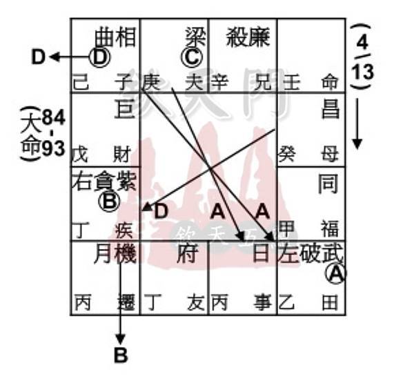 最美的一條線,就是文曲化忌(自化忌) ──→ 逢武曲化祿 (田宅宮)。